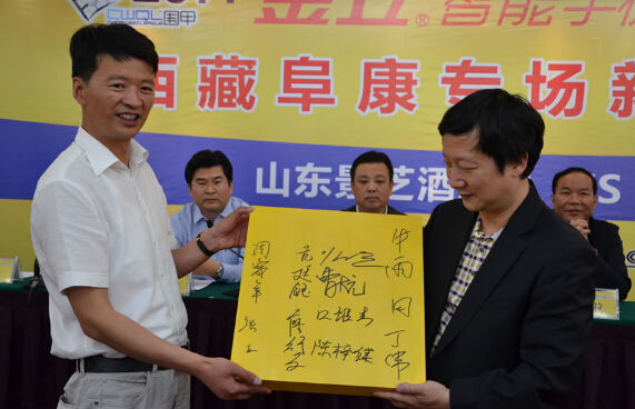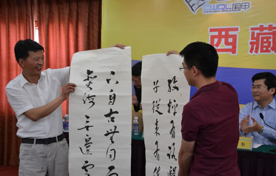 發(fā)布會(huì)最后曹大元九段代表兩隊(duì)棋手像王斌贈(zèng)送國手簽名的棋盤,王斌則用三幅字回贈(zèng)兩隊(duì)。