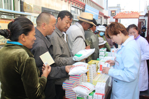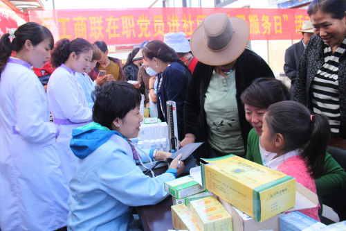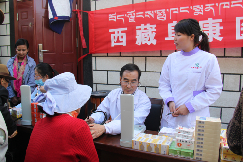 根據自治區(qū)工商聯《關于深化區(qū)直機關在職黨員到社區(qū)服務群眾活動》的統(tǒng)一安排:阜康醫(yī)藥有限公司四個黨支部,在張德才總院長的帶領下,一行8人在2015年8月8日上午到拉薩市城關區(qū)嘎瑪貢桑社區(qū)進行義診活動,帶著1.5萬余元藥品和便攜式B超,心電圖等。在半天時間內貢義診380余人,為社區(qū)群眾進行了測量血壓、發(fā)放藥品、健康咨詢等,受到了社區(qū)群眾的熱烈歡迎。期間正在慰問群眾的自治區(qū)政協副主席阿沛晉源,和區(qū)統(tǒng)戰(zhàn)部副部長、區(qū)工商聯黨組副書記李瑞富等領導的高度評價。