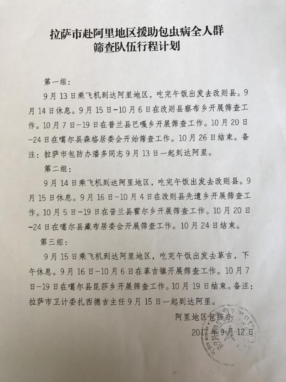 經(jīng)了解,此次包蟲篩查工作,拉薩市衛(wèi)計委邀請并組織3支共18人的醫(yī)療小分隊。我院是第三組,分在阿里的革吉鎮(zhèn)和噶爾縣昆莎鄉(xiāng)兩個篩查點,共將篩查3564人。另外兩組分別是改則縣察布鄉(xiāng)(2650人)和先遣鄉(xiāng)(2050人)。從分配工作計劃上看我組分配的篩查人員最多,人員也比較分散,給工作增加了難度,小組預(yù)計將9月17日~10月19日完成篩查工作。