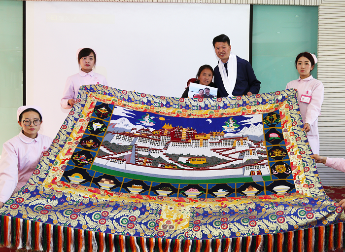 梅朵在出生后不久就被查出患有食道閉鎖、肛門畸形,在阜康全額資助下赴成都手術。手術后,梅朵的身體還是不太好,近兩年經(jīng)常住院,阜康醫(yī)院又為她減免全部的醫(yī)療費用,為了表達對阜康的感激之情,梅朵媽媽用3年時間,編織了一幅布達拉宮唐卡,在活動現(xiàn)場送給了王斌書記。