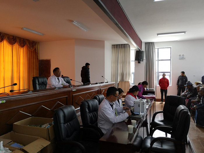 隨后,阜康義診隊對前來咨詢和檢查的牧民做了詳細的解答和初步的身體檢查。周健主治醫(yī)師負責(zé)測量血壓、了解老百姓的基本健康情況,唐宗青護士負責(zé)給牧民測血糖,瓊瑪副主任醫(yī)師和榮瑪鄉(xiāng)高海拔生態(tài)搬遷點醫(yī)務(wù)室的同志負責(zé)給老百姓發(fā)放藥品,工作在有條不紊中進行。