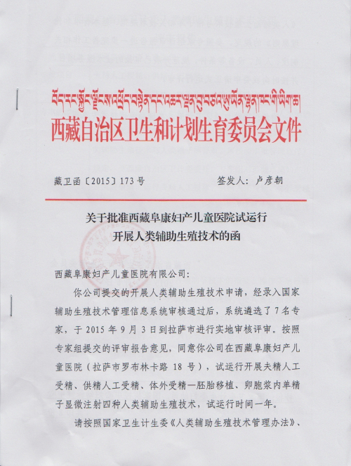 關(guān)于批準(zhǔn)西藏阜康婦產(chǎn)兒童醫(yī)院試運營開展人類輔助生殖技術(shù)的函
