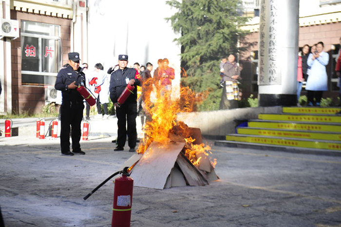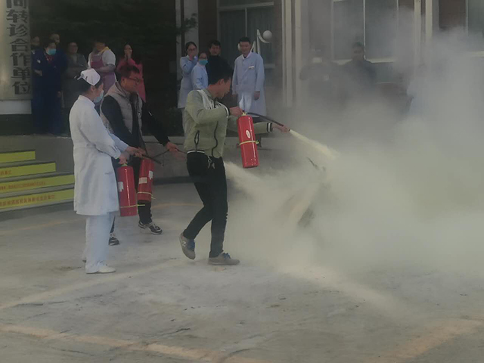 第二部分在我院住院區(qū)大院內(nèi),消防隊員進行了現(xiàn)場演示,講解了如何使用滅火器,并現(xiàn)場點燃了一堆火,使用滅火器將大火撲滅,以直觀的方式,告訴醫(yī)護人員如何使用滅火器材;我院員工也派出后勤、臨床代表參加了演練。