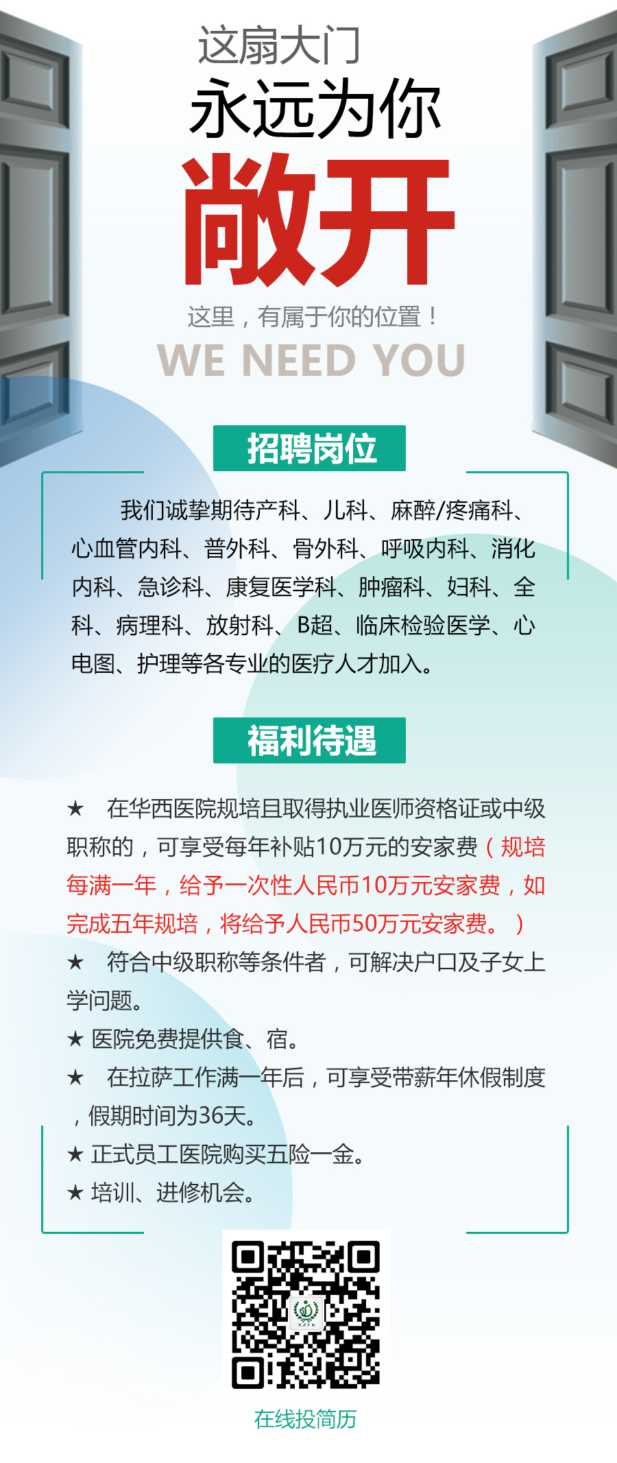 西藏阜康醫(yī)院面向社會(huì)公開招聘產(chǎn)科、兒科、麻醉/疼痛科、心血管內(nèi)科、普外科、骨科、呼吸內(nèi)科、消化內(nèi)科、急診科、康復(fù)醫(yī)學(xué)科、婦科、全科、病理科、放射科、B超、臨床檢驗(yàn)、心電圖等各專業(yè)的醫(yī)療人才。對(duì)于在華西醫(yī)院完成住院醫(yī)師規(guī)范化培訓(xùn)且取得執(zhí)業(yè)醫(yī)師資格證或中級(jí)職稱的醫(yī)師,一經(jīng)錄用,按參加規(guī)培年限每年10萬給付安家費(fèi)(完成3年規(guī)培,給予30萬安家費(fèi);完成5年規(guī)培,提供安家費(fèi)的規(guī)培醫(yī)師必須簽訂合同在阜康服務(wù)六年,否則按差額服務(wù)年限退回相應(yīng)的安家費(fèi)),工資獎(jiǎng)金另算。望廣大醫(yī)療人才踴躍投遞簡歷,為祖國西部醫(yī)療事業(yè)貢獻(xiàn)力量。