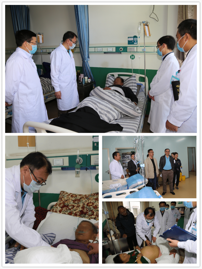 在阜康醫(yī)院住院部,周平紅教授一行換上工作服和阜康醫(yī)院消化內(nèi)科醫(yī)護(hù)人員一起查房。在44號(hào)尼珍的病床前,周平紅教授詳細(xì)詢問病人的生理、病理指標(biāo),阜康醫(yī)院醫(yī)護(hù)人員一一詳細(xì)回答。之后,周平紅教授走到病床前對(duì)患者的體征狀況進(jìn)行了仔細(xì)檢查,并向家屬詢問病人的實(shí)時(shí)病況。周平紅教授還來到89歲的患者扎西、離退休人員格桑的病床前,詢問了病人的各項(xiàng)指標(biāo)并仔細(xì)進(jìn)行了體征檢查。