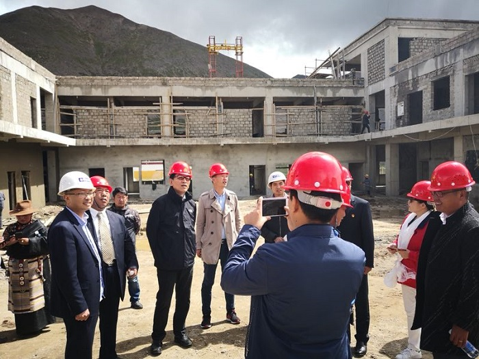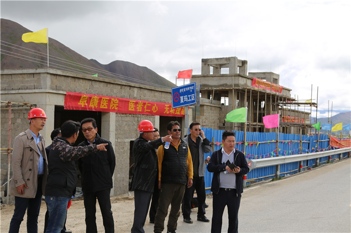2018年了8月9日,受阜康邀請,西藏自治區(qū)政協(xié)副主席、區(qū)工商聯(lián)主席、區(qū)總商會會長阿沛·晉源,拉薩大昭寺管家洛桑,西藏自治區(qū)社會科學(xué)院原處長次旺仁青,西藏阜康醫(yī)療股份有限公司黨委書記、董事長王斌,西藏阜康醫(yī)療股份有限公司黨委副書記、副總經(jīng)理陳彬,西藏阜康醫(yī)院名譽院長嘎布,阜康生殖醫(yī)學(xué)中心實驗室主任劉鋒,阜康體檢中心主檢師瓊瑪,阿沛·晉源主席秘書旦增一行早上8點從拉薩出發(fā),一路顛簸馳騁于下午2點50分許抵達那曲地區(qū)嘉黎縣夏瑪鄉(xiāng)。聽說晉源主席要來視察衛(wèi)生院的建設(shè)工作,嘉黎縣縣長吾金不顧受傷的左腿帶領(lǐng)當?shù)馗刹咳罕娫缭绲群蛟谙默斷l(xiāng)衛(wèi)生院建設(shè)現(xiàn)場。