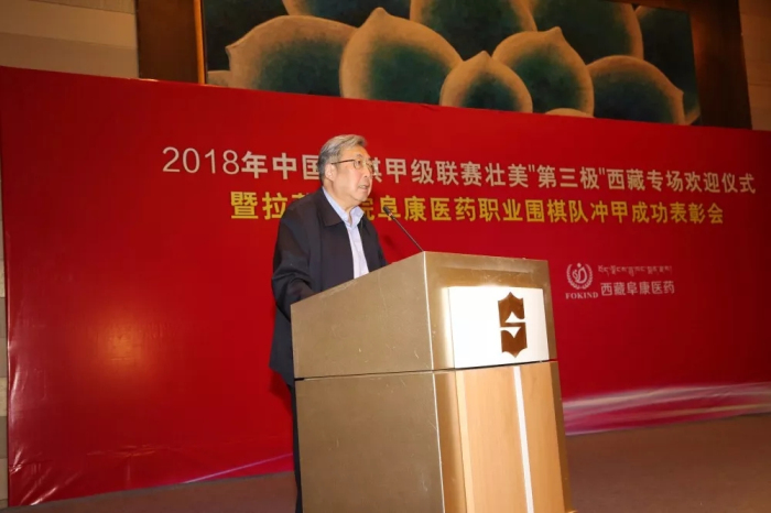 中國圍棋協(xié)會主席林建超將軍在致辭中表示,拉薩棋院西藏阜康醫(yī)藥職業(yè)圍棋隊沖甲成功是全國圍棋運動中的一件大事。它首先改變了當(dāng)代中國圍棋運動的版圖,雪域高原第一次在中國圍棋甲級聯(lián)賽中占有了一席之地;其次,這次沖甲實現(xiàn)了西藏體育發(fā)展的一次突破,使西藏在全國性的體育賽事中,擁有了第一支甲級職業(yè)隊伍;第三,本次沖甲成功,為圍棋文化和藏式棋類文化的交融促進提供了一個很好的契機,為西藏地區(qū)棋文化的發(fā)展起到了很好的推動作用。這項成績來之不易,首先應(yīng)該歸功于自治區(qū)各級黨委、政府的重視,尤其是齊扎拉主席長期以來對包括圍棋、藏式棋等棋類活動的支持,有效促進了這項中華民族優(yōu)秀傳統(tǒng)文化在雪域高原的普及與發(fā)展,這是與習(xí)近平總書記在十九大報告中提出的戰(zhàn)略目標(biāo)相一致的。
