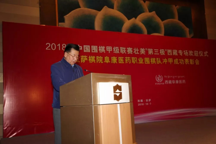 西藏自治區(qū)政府副主席甲熱·洛桑旦增代表自治區(qū)人民政府對各位嘉賓的到來表示熱烈歡迎。他說圍棋是一切棋類運動的鼻祖,是中華民族優(yōu)秀傳統(tǒng)文化的瑰寶,融合了軍事、哲學(xué)、詩詞等多種文藝形式,是中華民族幾千年來智慧的結(jié)晶,也是對人類文明的重要貢獻。在建設(shè)社會主義文化強國、體育強國、實現(xiàn)中華民族偉大復(fù)興的中國夢進程中,圍棋這樣一項由文化融進體育的智慧運動承擔(dān)著重要的歷史使命。拉薩棋院西藏阜康醫(yī)藥職業(yè)圍棋隊沖甲成功是西藏體育發(fā)展的重大突破,也是社會力量推動體育事業(yè)發(fā)展的典范。為此我代表自治區(qū)人民政府對西藏阜康醫(yī)藥職業(yè)圍棋隊沖甲成功表示熱烈祝賀,對社會各界支持西藏體育事業(yè)發(fā)展表示感謝,自治區(qū)政府將加快推進體育事業(yè)改革、做強做大體育產(chǎn)業(yè),促進全區(qū)體育事業(yè)再上臺階。祝愿2018年中國圍棋甲級聯(lián)賽壯美“第三極”西藏專場取得成功,祝愿西藏阜康醫(yī)藥職業(yè)圍棋隊在明年的甲級聯(lián)賽中取得更好成績。