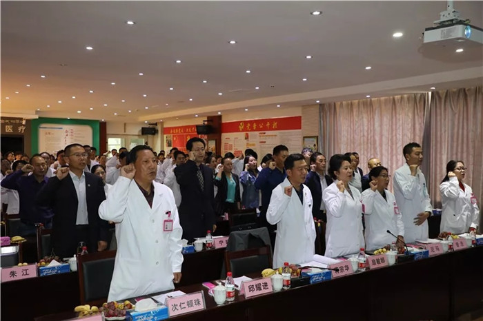 慶?;顒釉谙挛?5點(diǎn)準(zhǔn)時(shí)進(jìn)行。西藏阜康醫(yī)院醫(yī)務(wù)科主任田鵬帶領(lǐng)與會醫(yī)師代表宣讀“希波克拉底誓言”,西藏阜康醫(yī)院婦產(chǎn)兒童院區(qū)(院區(qū)三)劉連福院長致辭。