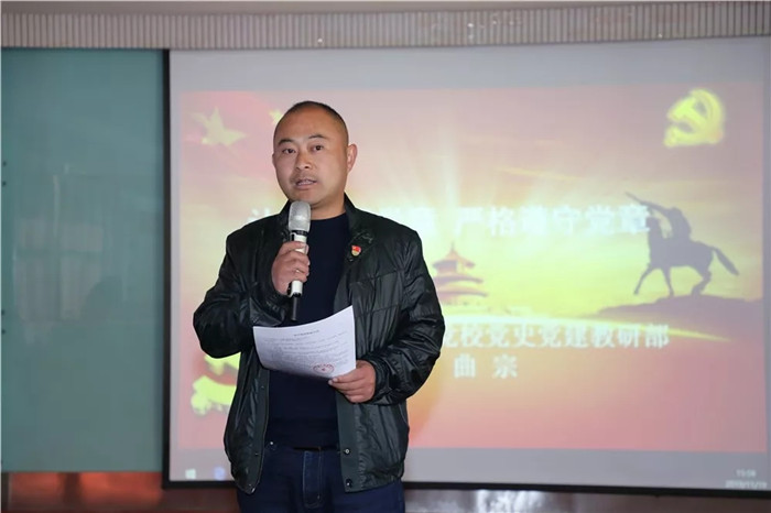 曲宗副教授首先明確了黨章 “根本大法”的地位,指出黨章是規(guī)范和指導(dǎo)黨的工作、黨內(nèi)活動(dòng)、黨的建設(shè)的根本依據(jù)。隨后曲宗副教授介紹了黨章的歷史沿革,以及十九大修改黨章的歷史意義和重要內(nèi)容,號(hào)召每一名黨員認(rèn)真學(xué)習(xí)黨章,嚴(yán)格遵守黨章,時(shí)刻與黨中央保持一致,自覺做到“兩個(gè)維護(hù)”。要求每一名黨員都把黨章作為政治思想建設(shè)方面的X光機(jī),每年對(duì)照黨章給自己“體檢”一下,紅紅臉、出出汗,牢記入黨初心、遵守黨的紀(jì)律,維護(hù)一名黨員的思想行為純潔性。
