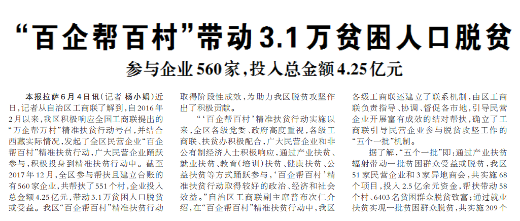 本報(bào)拉薩6月4日訊(記者 楊小娟)近日,記者從自治區(qū)工商聯(lián)了解到,自2016年2月以來,我區(qū)積極響應(yīng)全國(guó)工商聯(lián)提出的“萬企幫萬村”精準(zhǔn)扶貧行動(dòng)號(hào)召,并結(jié)合西藏實(shí)際情況,發(fā)起了全區(qū)民營(yíng)企業(yè)“百企幫百村”精準(zhǔn)扶貧行動(dòng),廣大民營(yíng)企業(yè)踴躍參與,積極投身到精準(zhǔn)扶貧行動(dòng)中。截至2017年12月,全區(qū)參與幫扶且建立臺(tái)賬的有560家企業(yè),共幫扶了551個(gè)村,企業(yè)投入總金額4.25億元,帶動(dòng)3.1萬貧困人口脫貧或受益。我區(qū)“百企幫百村”精準(zhǔn)扶貧行動(dòng)取得階段性成效,為助力我區(qū)脫貧攻堅(jiān)作出了積極貢獻(xiàn)。
