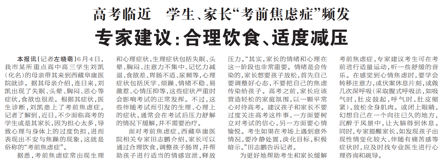 面對考前焦慮癥,西藏阜康醫(yī)院相關(guān)專家田志鵬介紹,家長可以通過合理飲食,調(diào)整孩子腸胃,并幫助孩子進(jìn)行適當(dāng)?shù)那楦行?,釋放壓力?ldquo;其實(shí),家長的情緒和心理在這一階段也非常重要。情緒是會傳染的,家長想要孩子放松,首先自己要調(diào)整好心態(tài),不要把自己的焦慮傳染給孩子。高考之前,家長應(yīng)該營造輕松的家庭氛圍,以一顆平常心對待高考。建議孩子和家長不要過度關(guān)注高考這件事,一方面要樹立對考試的信心,另一方面要心情愉悅。考生如果在考場上遇到意外情況,要冷靜處置,淡化目標(biāo),積極暗示。”田志鵬告訴記者。