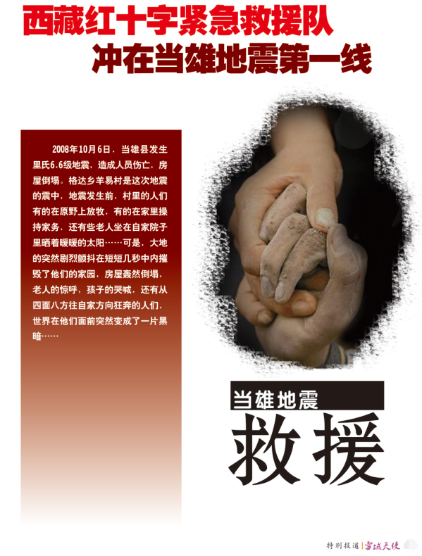 2008年10月6日,當(dāng)雄縣發(fā)生里氏6.6級(jí)地震,造成人員傷亡,房屋倒塌。格達(dá)鄉(xiāng)羊易村是這次地震的震中,地震發(fā)生前,村里的人們有的在原野上放牧,有的在家里操持家務(wù),還有些老人坐在自家院子里曬著暖暖的太陽(yáng) 可是,大地的突然劇烈顫抖在短短幾秒中內(nèi)摧毀了他們的家園,房屋轟然倒塌,老人的驚呼,孩子的哭喊,還有從四面八方往自家方向狂奔的人們,世界在他們面前突然變成了一片黑暗.....