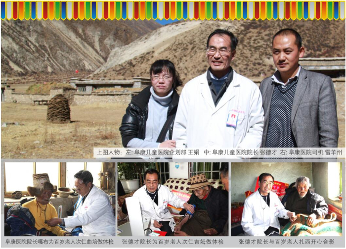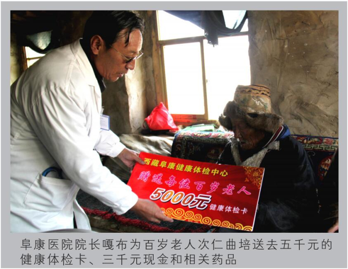 西藏高寒缺氧,自然環(huán)境惡劣。60多年前,這里的人均壽命才35.5歲。然而到了2012年,光拉薩的七縣一區(qū)就有16位百歲老人,正是這些百歲老人,見(jiàn)證了西藏翻天覆地的巨變,他們是全社會(huì)的寶貴財(cái)富,更是西藏從貧窮落后走向繁榮富強(qiáng)的親歷者、見(jiàn)證者。在全國(guó)人民喜迎黨的十八大勝利召開(kāi)之際,西藏阜康(國(guó)際)健康體檢中心與拉薩市民政局老齡辦組織發(fā)起了“關(guān)愛(ài)百歲老人行動(dòng)”。此次行動(dòng)歷時(shí)16天,里程2000多公里,尋訪了拉薩七縣一區(qū)十一位百歲老人,不僅為每位老人送上了精心準(zhǔn)備的三千元現(xiàn)金、五千元健康體檢卡、一個(gè)便攜式氧氣瓶、一個(gè)便攜式血壓儀,還為他們送上了免費(fèi)義診和相關(guān)藥品。王斌董事長(zhǎng)參加了此項(xiàng)活動(dòng)的啟動(dòng)儀式,嘎布院長(zhǎng)、張德才院長(zhǎng)親自帶隊(duì)為每一位百歲老人做了常規(guī)的身體檢查,并送上了藥品和祝福。