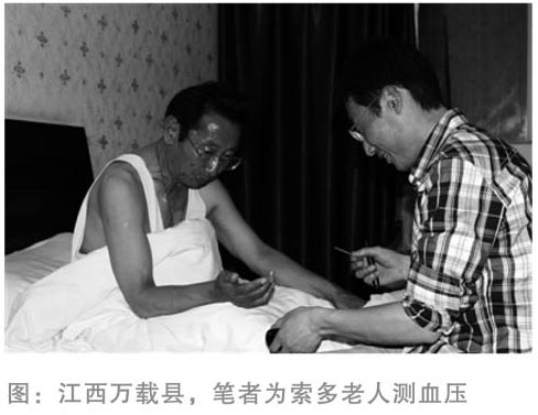 我們5月15日從拉薩出發(fā),一路向東,到成都轉(zhuǎn)機,兩天的時間,已經(jīng)跨越了2400多公里。16日,載著夢想的飛機抵達(dá)了江西南昌機場,劉春生老人的大兒子在機場熱情地迎接我們,將我們接到老人的故鄉(xiāng)萬載縣。我們決定在縣城賓館休息一天后再啟程前往劉春生老人的家,于是我為同行的兩位老人做了全面的檢查,索多老人的血糖在7.0mmol/L左右,令我擔(dān)心的是昂瑪老人血壓本來就偏高而且又是第一次去內(nèi)地,他的血壓波動在140-150/90-100mmHg,比較平穩(wěn),我叮囑老人見面時注意控制情緒,不要過于激動。