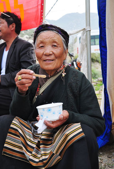 藏戲演出為另一重頭戲。從雪頓節(jié)的第二天開始,在羅布林卡及宗角祿康公園內(nèi),藏戲隊(duì)伍每天不停歇地從上午11點(diǎn)一直唱到暮色降臨。據(jù)說,因時(shí)間有限,這已經(jīng)是提取劇目中的精華部分,否則一出戲會(huì)唱上幾天。表演者自得其樂,觀賞者更是樂此不疲??▔|鋪在草地上,親朋好友閑適地圍坐在一起,擺上一路背來的青稞酒、酥油茶,還有自己做的各種藏式點(diǎn)心。很多藏民一邊聽著藏戲,一邊搖著手中的轉(zhuǎn)經(jīng)筒,或是捻著佛珠,臉上露出幸福的微笑。