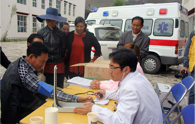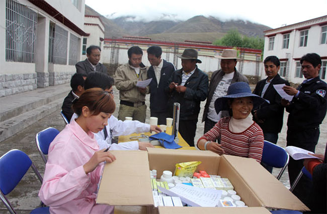 通過為尼木縣鄉(xiāng)村小學老師們的體檢,董發(fā)善醫(yī)生說:“大部分老師都患有血管神經(jīng)性頭疼和不同程度的胃病和膽囊疾病。這是由于在鄉(xiāng)村學校中,老師們工作繁忙,經(jīng)常忘記吃飯或者到了吃飯的時候就湊合吃幾片風干肉,喝幾杯酥油茶。這是造成鄉(xiāng)村老師腸胃和膽囊疾病的主要原因。此外,由于老師們經(jīng)常站著講課,腰椎疾病的患病率比其他行業(yè)的要高。”在體檢的同時,醫(yī)護人員還向老師們發(fā)放了常見疾病預防知識的宣傳材料。