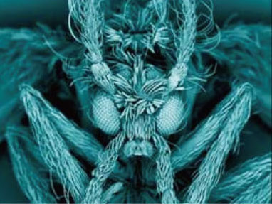 這是偽彩色處理的掃描電鏡下的毛蠓(moth fly,又稱蛾蠅)。這種蠅類的幼蟲習(xí)慣繾綣在人們家中的下水道里,時(shí)不時(shí)會(huì)從水槽里冒出來。毛蠓的軀體和翅膀上都覆被著微小的纖毛,所以看起來很像蛾子。