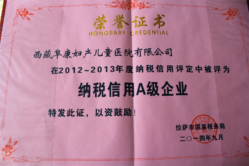 2014年10月17日,拉薩市國稅局召開“拉薩市2012-2013年度納稅信用等級A級納企業(yè)”榮譽表彰大會。西藏阜康兒童醫(yī)院有限公司被評為“納稅信用A級企業(yè)”。