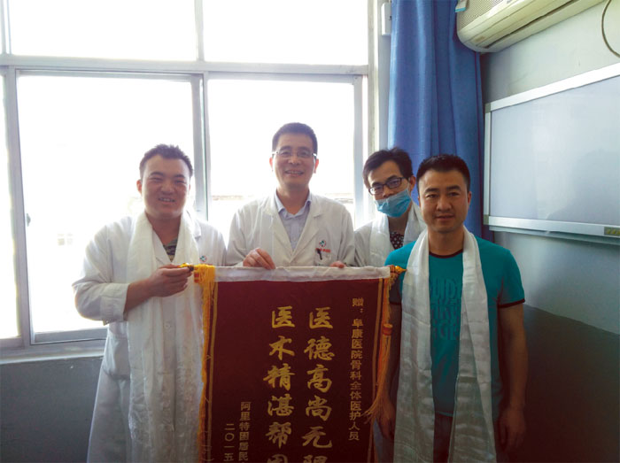 2015年5月23日,外一科收治一名來(lái)自曲樂(lè)鄉(xiāng)尼雄二村名叫扎西(化名)的病人,診斷為右脛骨開(kāi)放性粉碎性骨折并大面積皮膚壞死,住院63天,共四次手術(shù)。因經(jīng)濟(jì)困難,無(wú)法承擔(dān)所欠的四萬(wàn)兩千余元。向上級(jí)領(lǐng)導(dǎo)匯報(bào)后,王斌董事長(zhǎng)指示:先治病,所欠費(fèi)用由雪域天使基金會(huì)補(bǔ)充。出院當(dāng)天,患者及家屬為我院骨科醫(yī)生獻(xiàn)上哈達(dá)和錦旗以表感謝之情。