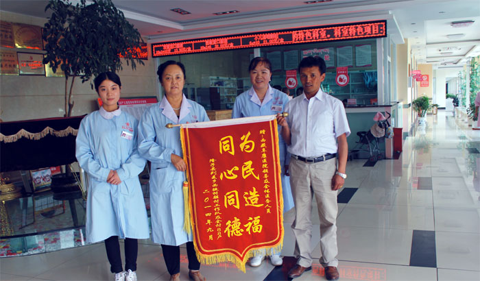 2014年阜康義診隊(duì)奔赴山南地區(qū)隆子縣開展免費(fèi)義診送醫(yī)送藥活動(dòng),共有300多名村民就診,發(fā)放藥品2萬余元。為了向阜康醫(yī)護(hù)人員表示感謝,2015年7月30日山南地區(qū)社保局醫(yī)保中心主任邊旦次仁,代表隆子縣列麥鄉(xiāng)西徒村駐村工作隊(duì)及全村88戶村民來到阜康醫(yī)院婦產(chǎn)兒童分院,為我院醫(yī)務(wù)人員送來了感謝錦旗,敖德秀院長(zhǎng)作為院方代表接受了這份榮譽(yù)。