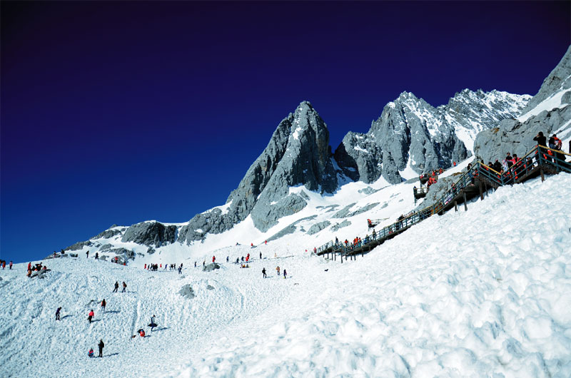人文的掃興,索性來場自然之旅。第二天一大早我們就前往了玉龍雪山,還是被告知到達最高峰的索道票昨日售盡,我們的索道只到得了松杉坪?;貞浧饋?,這也許值得慶幸。松杉坪松樹高聳如云,木棧道旁有積雪未化,風過樹梢的積雪隨風灑落,偶爾有小松鼠一躍而過,牦牛悠閑自在的吃著草,遠處是玉龍雪山的最高峰,仿佛近在咫尺。我想所有的生生死死都應該在這里戛然而止,所有浮躁的靈魂都應該在這里接受洗禮,進入輪回,拋卻紅塵暫享這片刻的永生。她是我去過最接近天堂的地方,