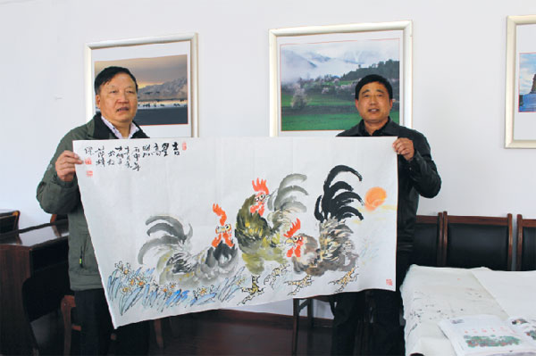 3月28日受自治區(qū)文聯(lián)黨組書記兼副主席沈開運(yùn)邀請陳明文先生在自治區(qū)文聯(lián)會(huì)議室作文化交流。交流會(huì)上陳明文先生展示了自己的近期作品,沈開運(yùn)主席代表自治區(qū)文聯(lián)收錄了其畫作《吉星高照》。