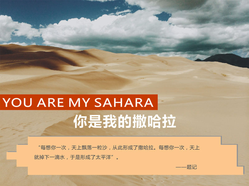回想起第一次與你邂逅是在你《撒哈拉沙漠的故事》里,走進(jìn)你的撒哈拉,即使這里狂風(fēng)驟沙,我仍可見你內(nèi)心深處的安寧與幸福,你仿佛化作一只輕柔的蝶穿梭在這片風(fēng)塵里,尋覓著這里每一粒沙,每一顆石,每一縷風(fēng),洋溢著生活里的寧靜與美好,只因那最愛你的蝶一直陪在你身旁,如此簡單。