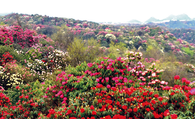 每年的3、4月份是杜鵑花盛開(kāi)的時(shí)期,放眼望去,方圓百里滿山遍野綠花似雪球;有彩紅、淡紅、紫紅、淡紫、雪白等顏色,色彩斑爛,熱情似火。