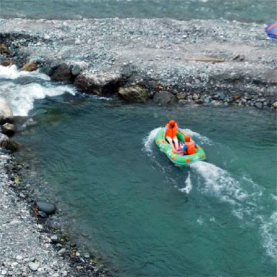 翌日,一大早醒來推開窗戶,便被外面的風(fēng)景迷住了。霧氣形成一道道白色的緞帶,披在了群山的肩上腰間。木樓的露天陽臺上,同事們都在不停的感嘆和拍照,亦有人在閉目養(yǎng)神,感受大自然的氣息。一起吃過早餐,車隊(duì)便駛向白沙河畔,開始了我們期待已久的重頭戲——虹口漂流。虹口漂流被譽(yù)為“西部第一漂”,全程近萬米,且落差明顯,不但能讓人享受“乘風(fēng)破浪,激情飛揚(yáng)”的驚險(xiǎn)樂趣,也能讓人感受到“遠(yuǎn)喧囂而返林、近山野而歸真”的生態(tài)魅力。自由漂的皮艇兩人一艇,經(jīng)過初步的適應(yīng)之后,不同皮艇上的同事們紛紛拿起水瓢,水槍,頭盔等互相潑灑起來,而岸邊的游客也不甘寂寞,拿起各種“武器”參與進(jìn)來。